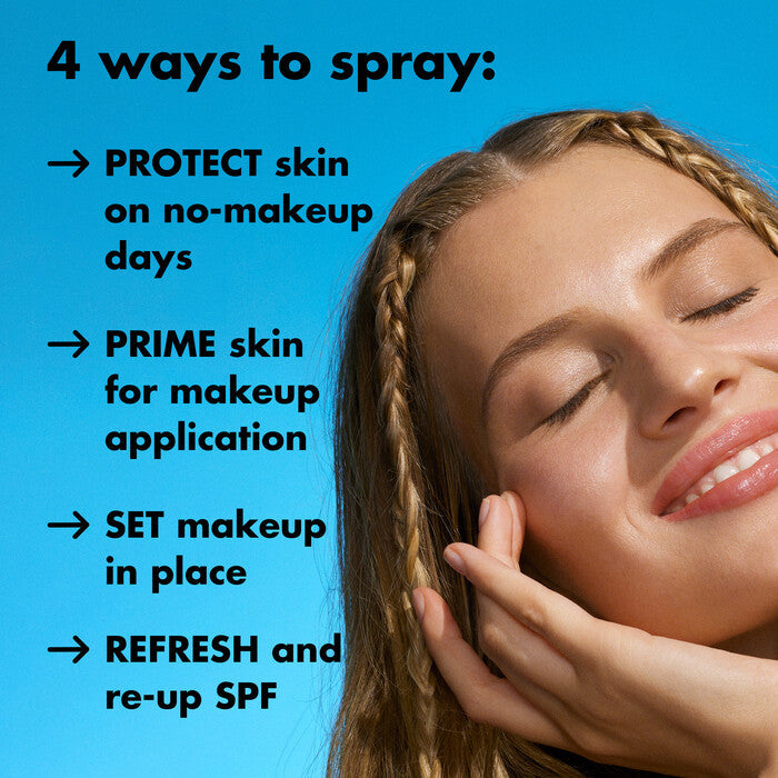 A clear, quick-dry sunscreen setting spray with broad-spectrum SPF 45 that easily reapplies over makeup and locks in your look for long-lasting wear with a natural finish.