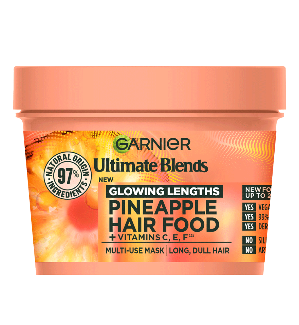 Discover NEW Garnier Ultimate Blends Pineapple & Amla Hair Food Multi-Use Mask for long dull hair, now boosted with Vitamins C, E, F for your healthiest hair ever. Vitamin C is known for intense shine, Vitamin E makes hair feel moisturised and Vitamin F makes hair look stronger. Blended in our best-rated formula with nourishing Shea Butter and natural oils.