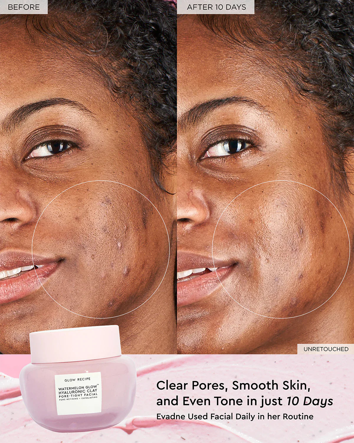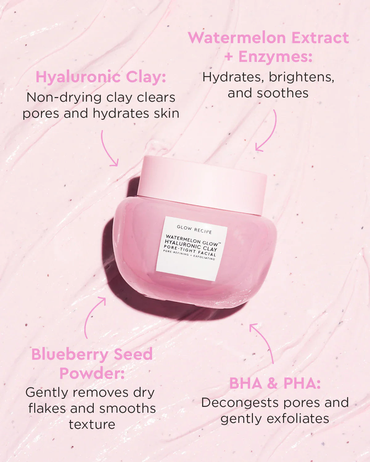 Meet your ultimate facial in a jar. This non-drying pore facial with hyaluronic acid-infused kaolin clay instantly minimizes the look of pores, evens tone, and hydrates all skin types. Proprietary hyaluronic-acid-infused whipped clay frees skin of cell buildup while chemical exfoliants, watermelon enzymes, BHA, & PHA, clear congested pores. Combined with gentle physically exfoliating micronized blueberry seed powder, this 5-minute facial decongests pores to unveil softer, brighter, and clearer-looking skin.