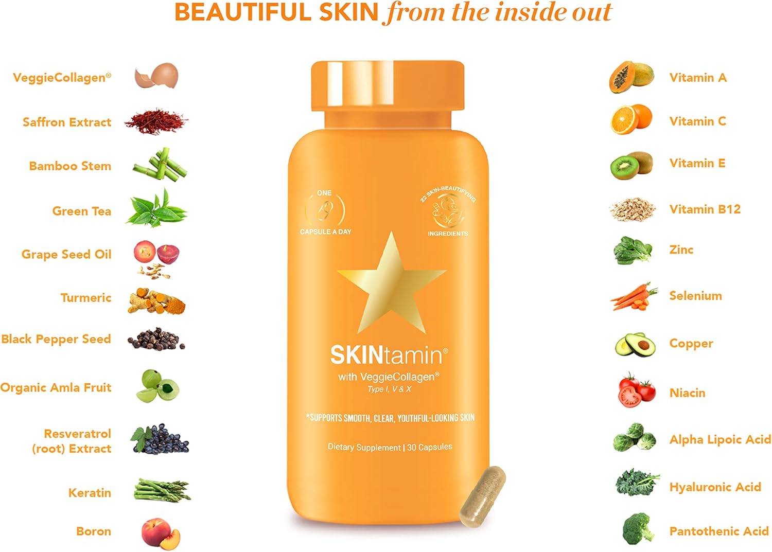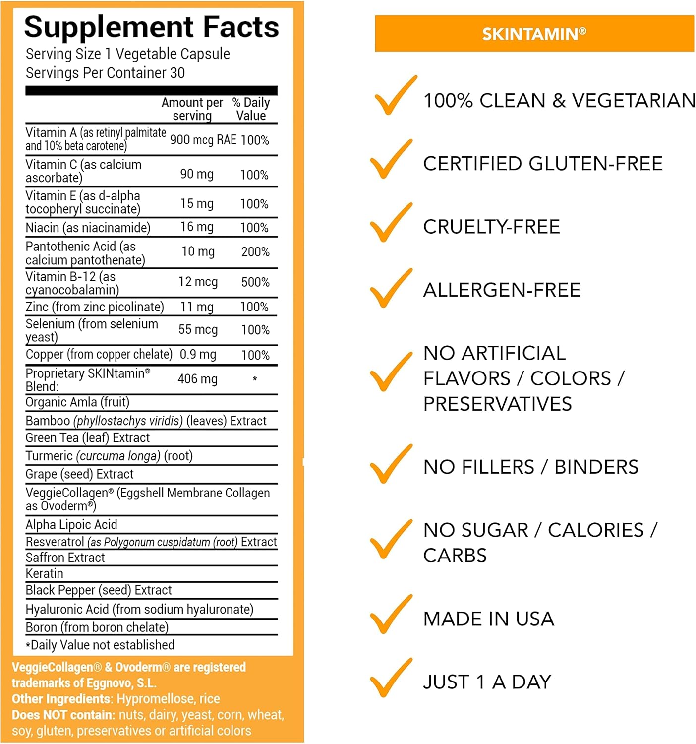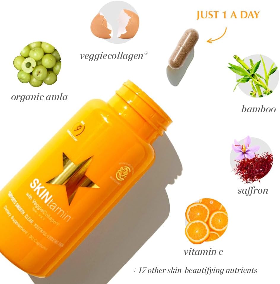 A comprehensive, physician-formulated, once-daily skin-beautifying formula with 22 clean ingredients including cruelty-free collagen (type I, V & X) sourced from eggshell membrane, organic amla fruit, saffron extract, resveratrol, vitamin A, C, E, B12, zinc and hyaluronic acid to help support skin health from the inside out. Just 1 capsule a day.