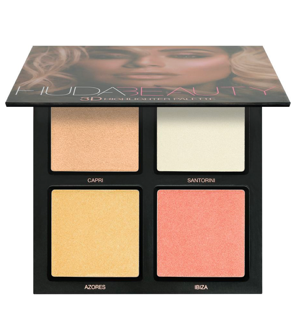 Huda Beauty's 3D highlighter palette for fair-to medium skin tones houses two types of highlighters. One is cream based, and the other three are powder based. It carries a pink sand color stream, with different shades of light-medium beige gold, white gold, golden orange and soft coral pink. When blended together, they highlight the cheekbones, area above Cupid's bow, and the bridge of your nose perfectly.