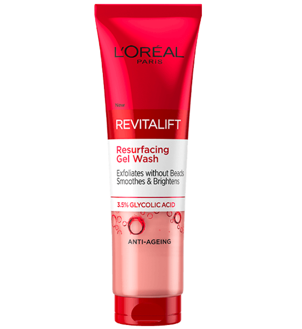 Formulated with 3.5% Glycolic Acid, the L'Oréal Paris Glycolic Resurfacing Gel Wash cleanser exfoliates without beads to visibly smooth & brighten skin. Exfoliates, smoothes and brightens skin.