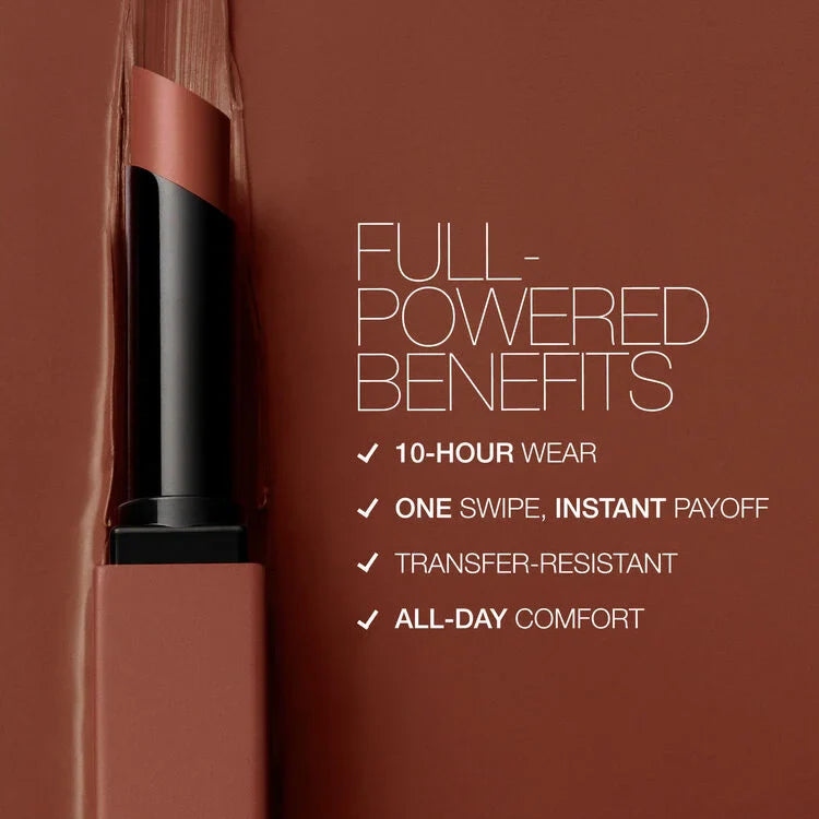 Play with a high-intensity matte sensation. In just one swipe it glides on bold color that lasts for 10 hours and sets to a smooth, matte finish. Power Pigment Complex—a dynamic blend of pure pigments and color-locking ingredients—saturates lips with dense color that glides effortlessly and wears comfortably all day. A lineup of 24 transfer-resistant shades let you choose every power move.