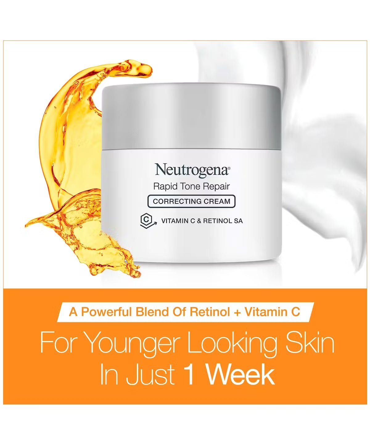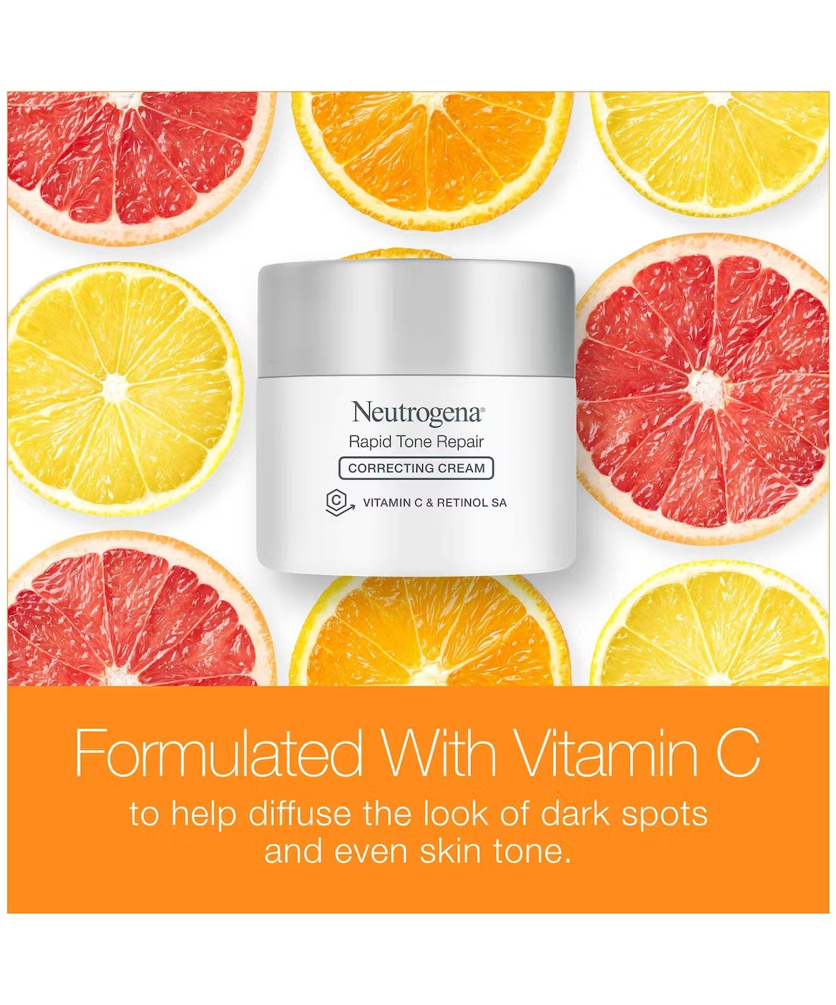 Moisturize, plump, and brighten your skin with Neutrogena® Rapid Tone Repair Correcting Cream. Visibly brighten skin tone for younger looking skin. This daily brightening cream is clinically proven to help reduce the look of even the most stubborn dark spots and diminish the look of discoloration and blotchiness while smoothing the look of fine lines and fading the look of deep wrinkles. Formulated with Vitamin C, Retinol, Glucose Complex, and Hyaluronic Acid for noticeably even skin tone in just one week.