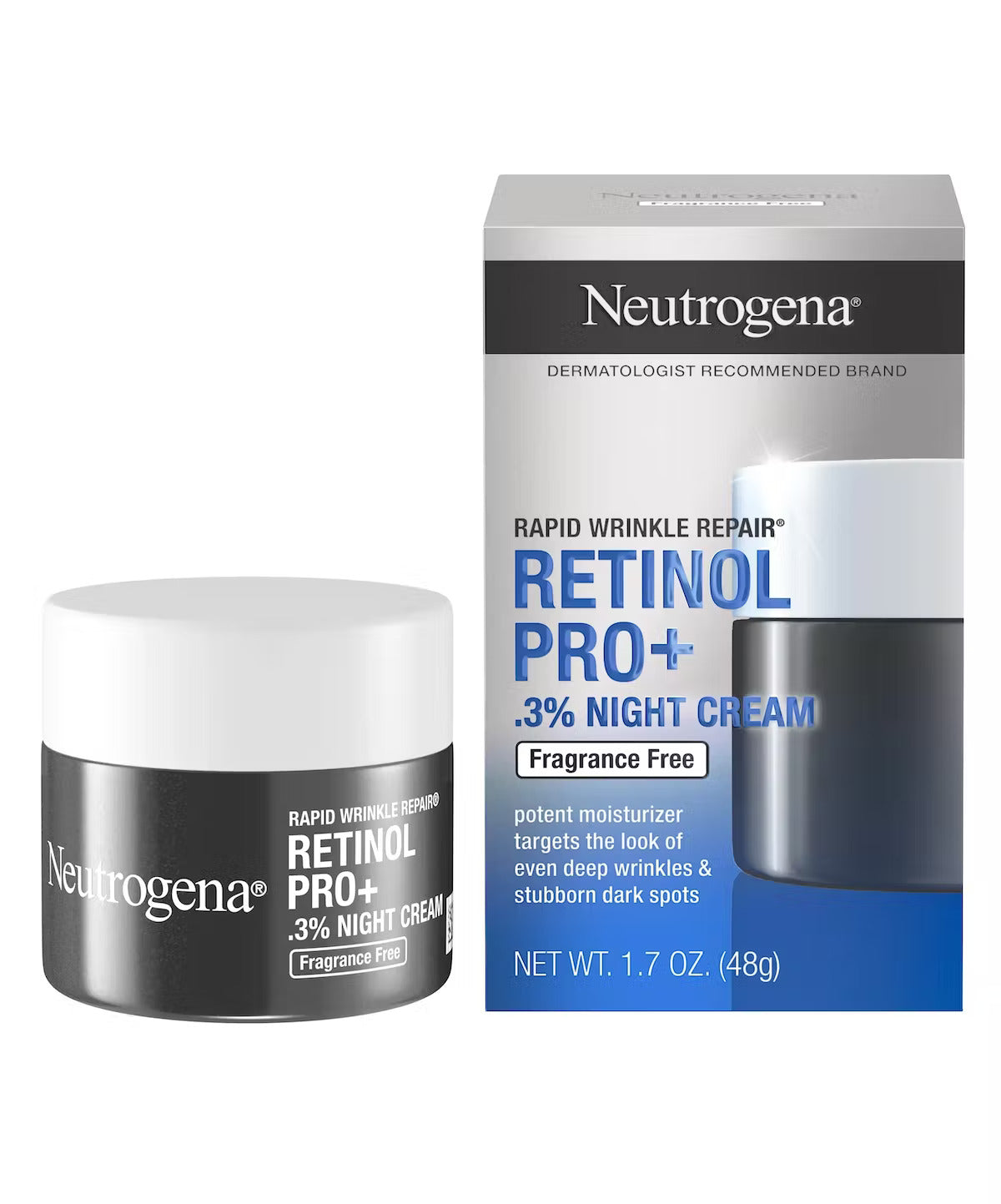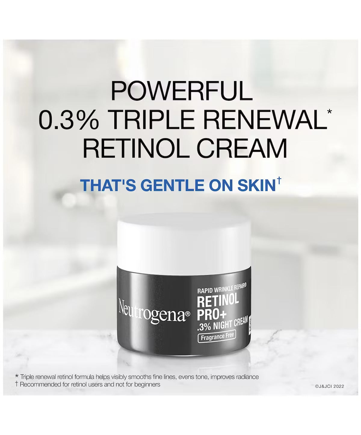 Neutrogena Rapid Wrinkle Repair® Retinol Pro+ 0.3% Night Cream targets the look of even deep wrinkles and stubborn dark spots – and it includes Hyaluronic Acid to hydrate skin. This powerful, triple-renewal 0.3% retinol cream is clinically proven to fight the signs of aging while still being gentle* on skin. Formulated with a patented technology and expertly stabilized, this cream will help reveal smoother, softer, more radiant-looking skin in just one week.