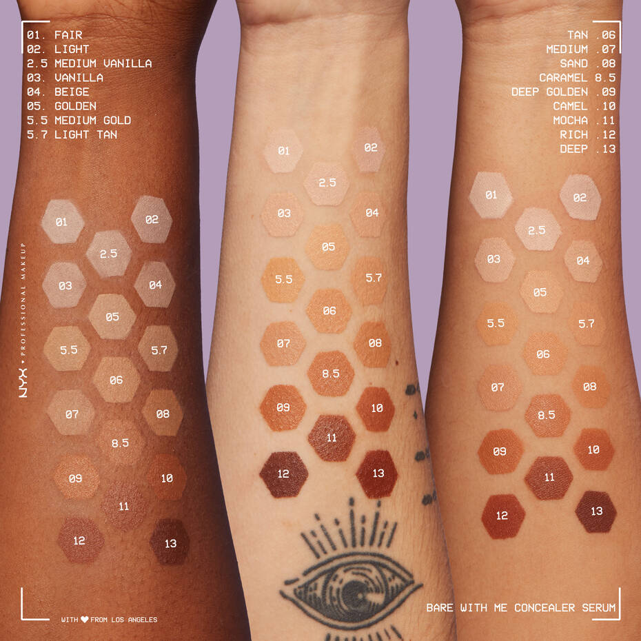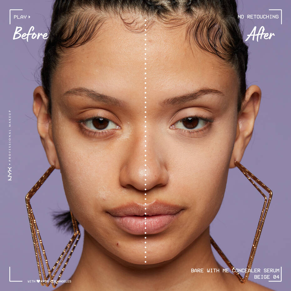 This is a skintervention! Say goodbye to skin stress with our newest addition to the Bare With Me family. At NYX Professional Makeup, we love an overachiever, and Bare With Me Concealer Serum is exactly that. Our gentle serum-concealer hybrid helps camouflage dark under-eye circles, blemishes, and dry skin patches—all while helping to hydrate the skin for up to 24 hours.