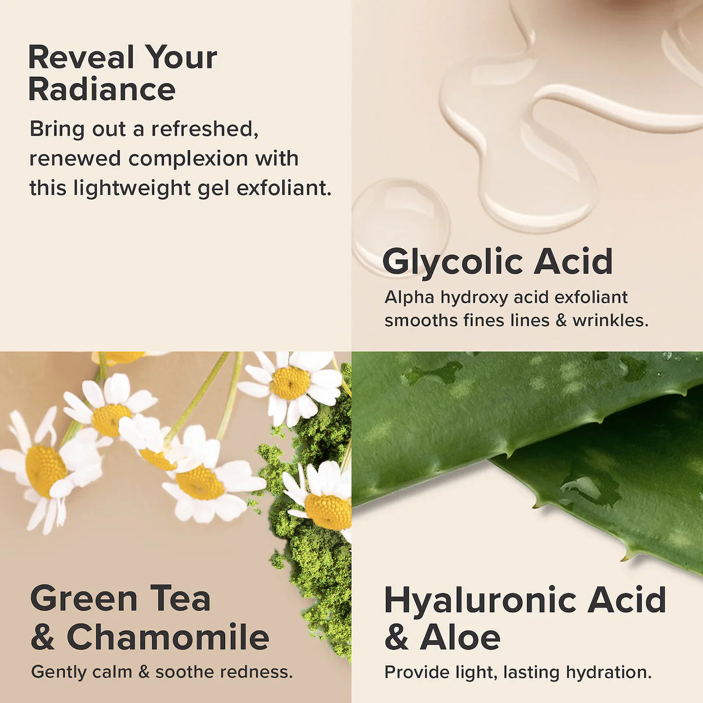 Water, Glycolic Acid, Sodium Hydroxide, Chamomilla Recutita Flower Extract, Aloe Barbadensis Leaf Juice Extract, Camellia Oleifera (Green Tea) Leaf Extract, Sodium Hyaluronate, Panthenol, Sodium PCA, Propylene Glycol, Butylene Glycol, Hydroxyethylcellulose, Polyquaternium-10, Phenoxyethanol, Sodium Benzoate