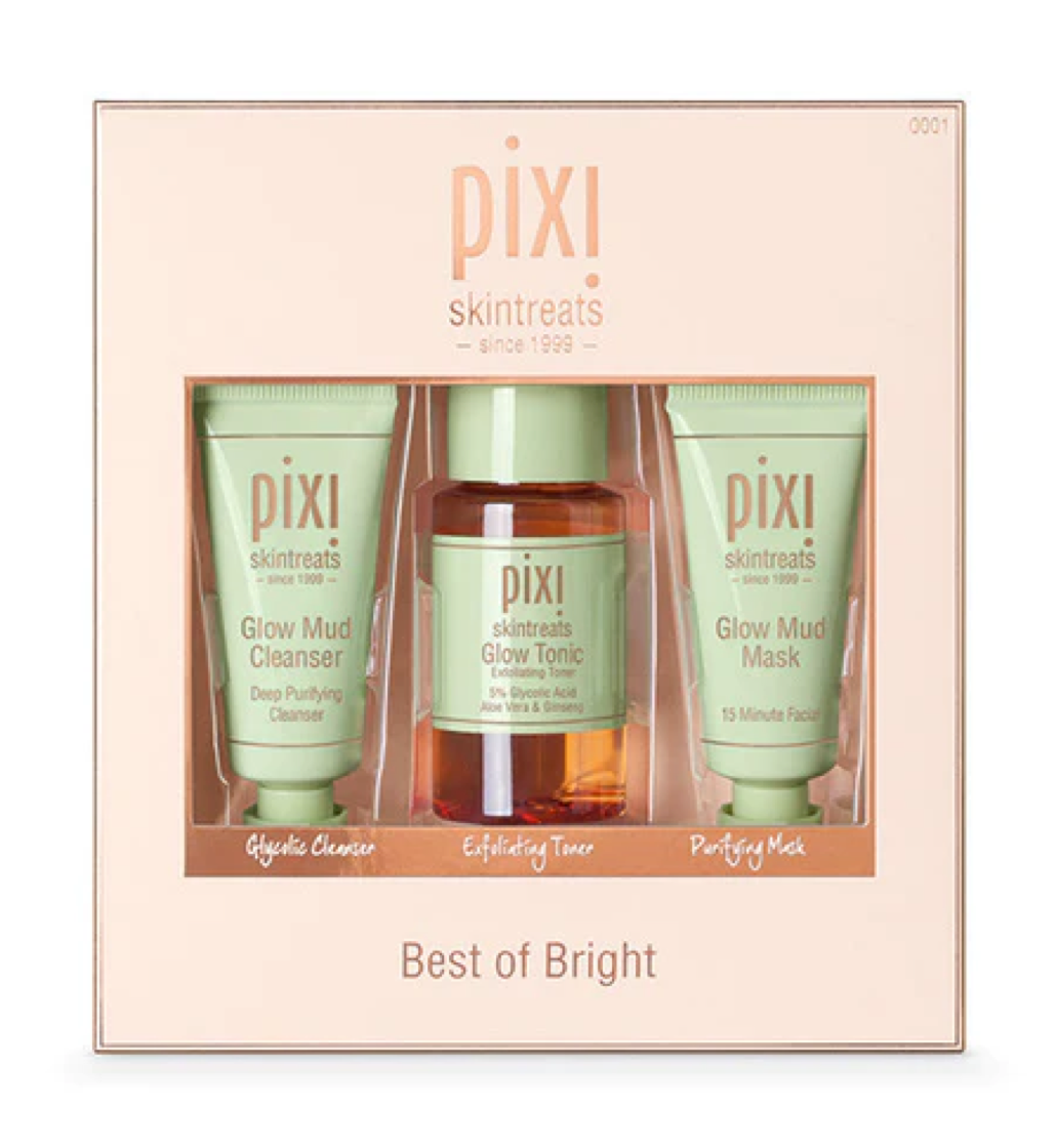• Getting that signature Pixi glow has never been easier! Kit contains: Deluxe travel sizes of Glow Mud Cleanser, Glow Tonic, Glow Mud Mask.