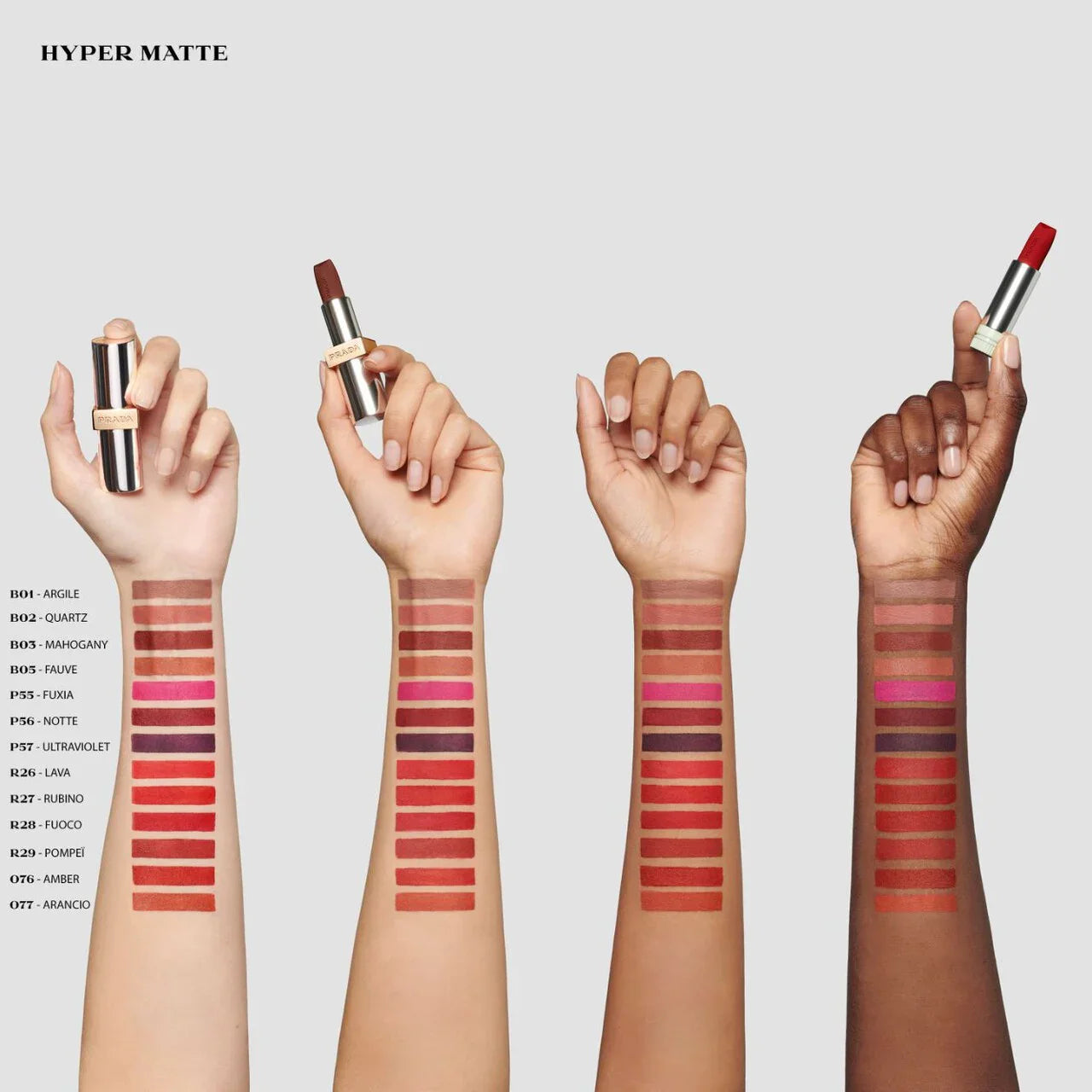 Prada Monochrome Hyper Matte delivers maximal color in one-stroke coverage. A sophisticated matte finish with long-lasting color and minimal feel on lips.