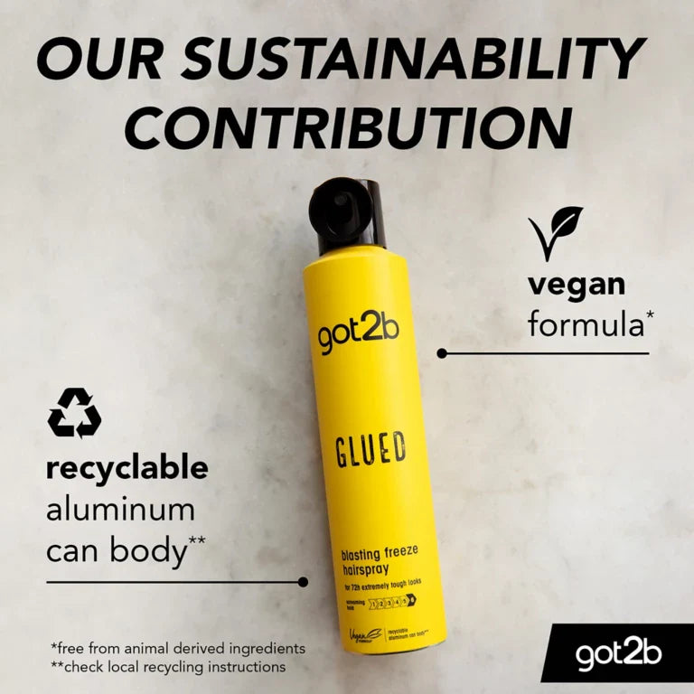 This got2b Glued Blasting Freeze Hairspray is made to create extremely tough looks. Our unique formula lets you shapeshift your hairstyles without having to worry about your hair feeling sticky or dry. Best of all, the vegan formula contains 46,3% natural-derived ingredients and comes in an recyclable aluminium can body.