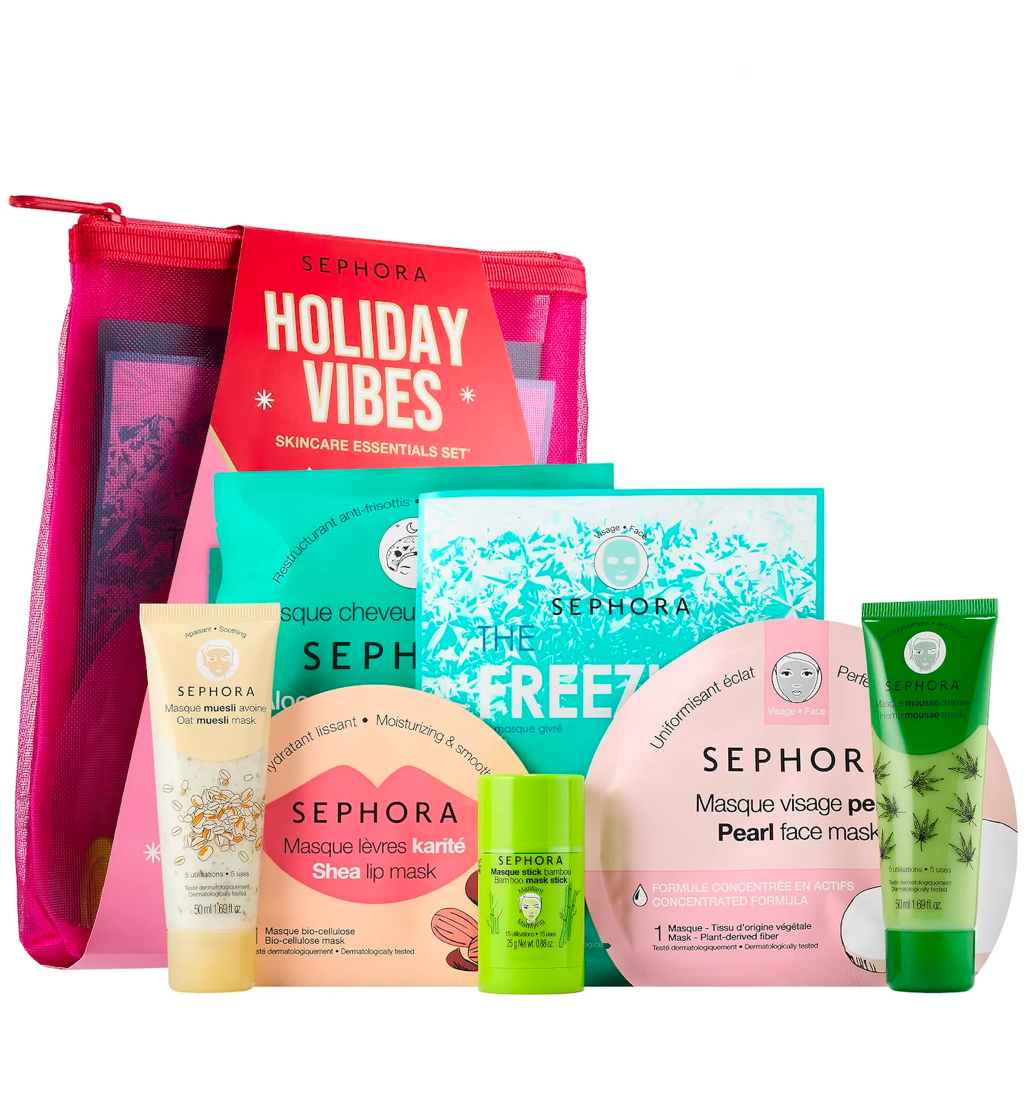 A reusable pouch containing the essential holiday skincare needs at a great price: five face masks, one lip mask, and one hair mask. The pouch is composed of 100 percent recycled plastic and the packaging comes from sustainably managed forests.