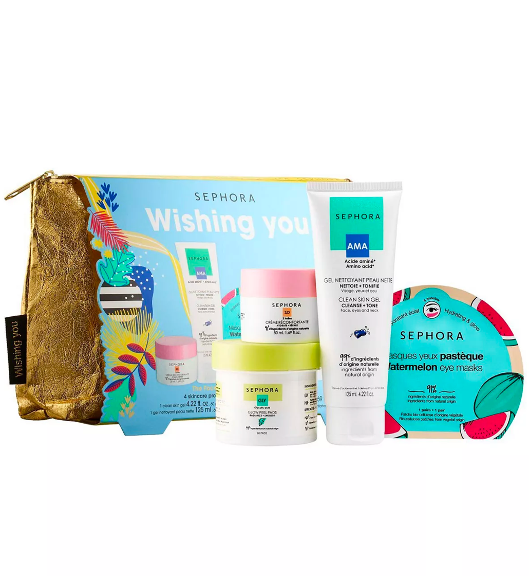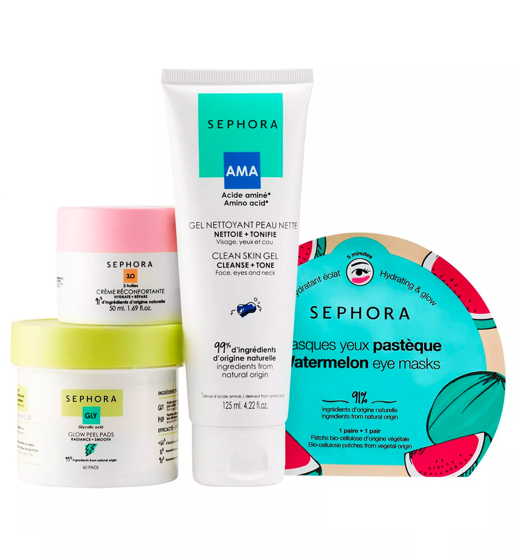 The Clean Skin Gel has amino acids and aloe vera that removes makeup while cleansing and soothing your skin. The Glow Peel Pads have glycolic acid, peptides, and aloe vera. The peel eliminates pore-clogging residue and dead skin cells. The Watermelon Eye Masks are bio-cellulose masks with vegan ingredients that in just five minutes target under-eye concerns like dryness and dark circles. The Nourishing Moisturizer have a cocktail of three natural origin oils, avocado, marula, and rose hip seed oil to nourish and protect the skin barrier.
