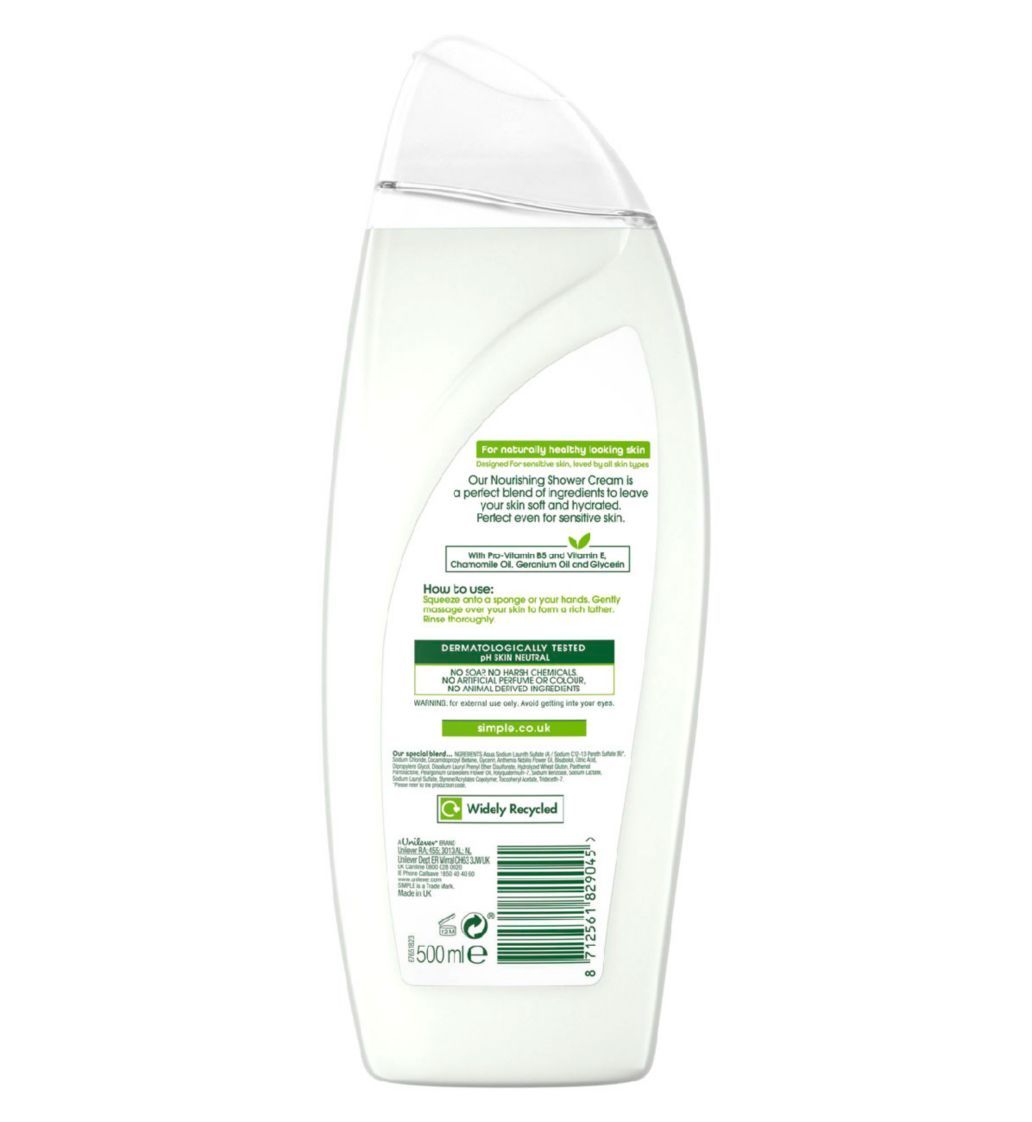 Simple's luxury shower cream is a perfect blend of ingredients to awaken and revitalise your skin. This shower cream has been dermatologically tested and approved, therefore it is an excellent sensitive skin shower cream and shower cream for dry skin. For the best results squeeze the Simple Kind to Skin foaming shower gel onto a sponge or on your hands. Then gently massage the shower gel over your skin to form a rich lather. Then simply rinse thoroughly. When using our Refreshing Shower Cream, avoid contact with eyes.