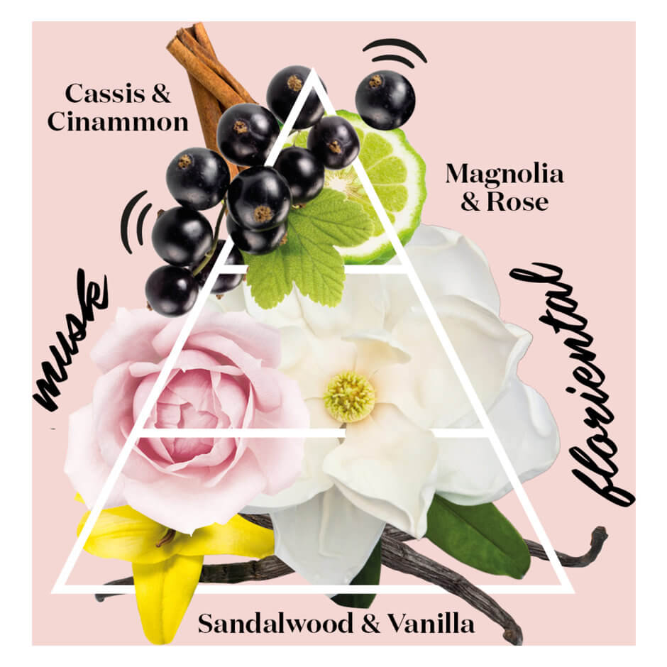 Bergamot, mandarin, blackcurrant, cassis, cinnamon, rose, jasmine, freesia, sandalwood, vanilla, warm musk & amber.