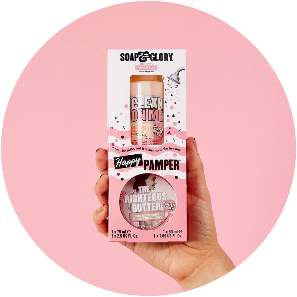 “Her time” prettily packaged, with two Soap & Glory ORIGINAL PINK rose-and-bergamot-fragranced award winners, including CLEAN ON ME™ Creamy Moisture Shower Gel with natural mandarin peel extract and a bonus built-in body lotion and THE RIGHTEOUS BUTTER™ Body Butter with skin softening shea butter and aloe vera.