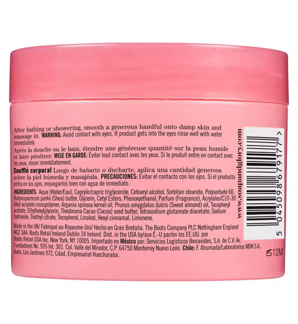 Aqua (Water/Eau), Caprylic/capric triglyceride, Cetearyl alcohol, Sorbitan stearate, Polysorbate 60, Butyrospermum parkii (Shea) butter, Glycerin, Cetyl Esters, Phenoxyethanol, Parfum (Fragrance), Acrylates/C10-30 Alkyl acrylate crosspolymer, Argania spinosa kernel oil, Prunus amygdalus dulcis (Sweet almond) oil, Tocopheryl acetate, Ethylhexylglycerin, Theobroma Cacao (Cocoa) seed butter, Tetrasodium glutamate diacetate, Sodium hydroxide, Triethyl citrate, Tocopherol, Linalool, Hexyl cinnamal, Limonene.