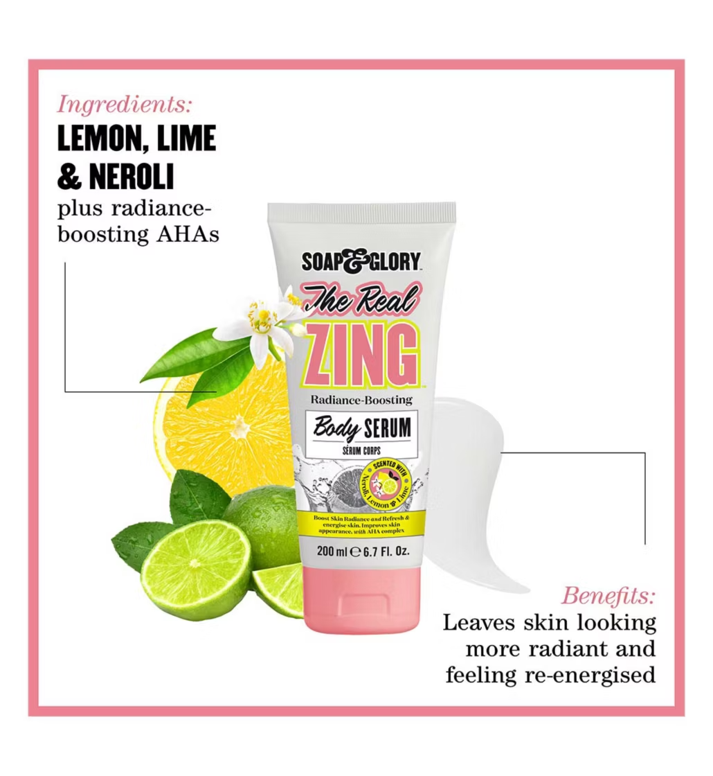Here at Soap & Glory, we’ve been concocting and creating something seriously smoothing, radiance-boosting, magically moisturising and positively pampering – and it’s safe to say that we’ve cracked it! Introducing The Real Zing™ Body Serum – quench your skin with a velvet touch serum that sinks into skin - giving incredible, intense moisturisation.