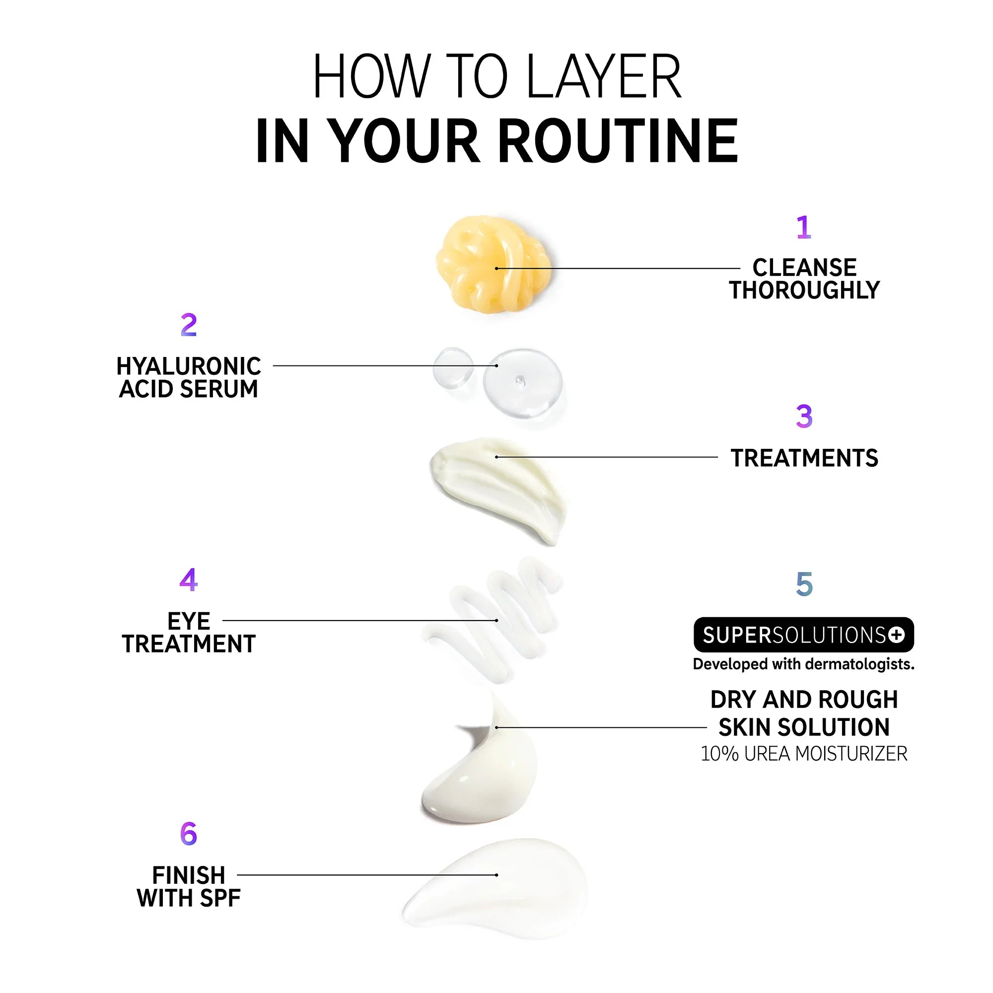 After cleansing and applying preferred serums, apply a pea-sized amount of Dry and Rough Skin Solution with 10% Urea to the face and neck.