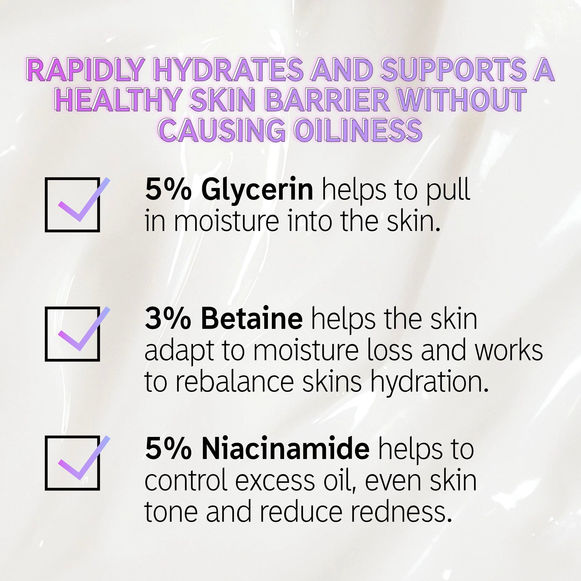 -Betaine Complex 3%: Reduces moisture loss and rebalances skin hydration.