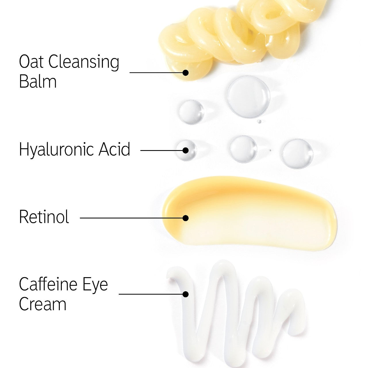 A set that includes four bestsellers: Oat Cleansing Balm, Hyaluronic Acid Serum, Retinol Serum, and Caffeine Depuffing Eye Cream.