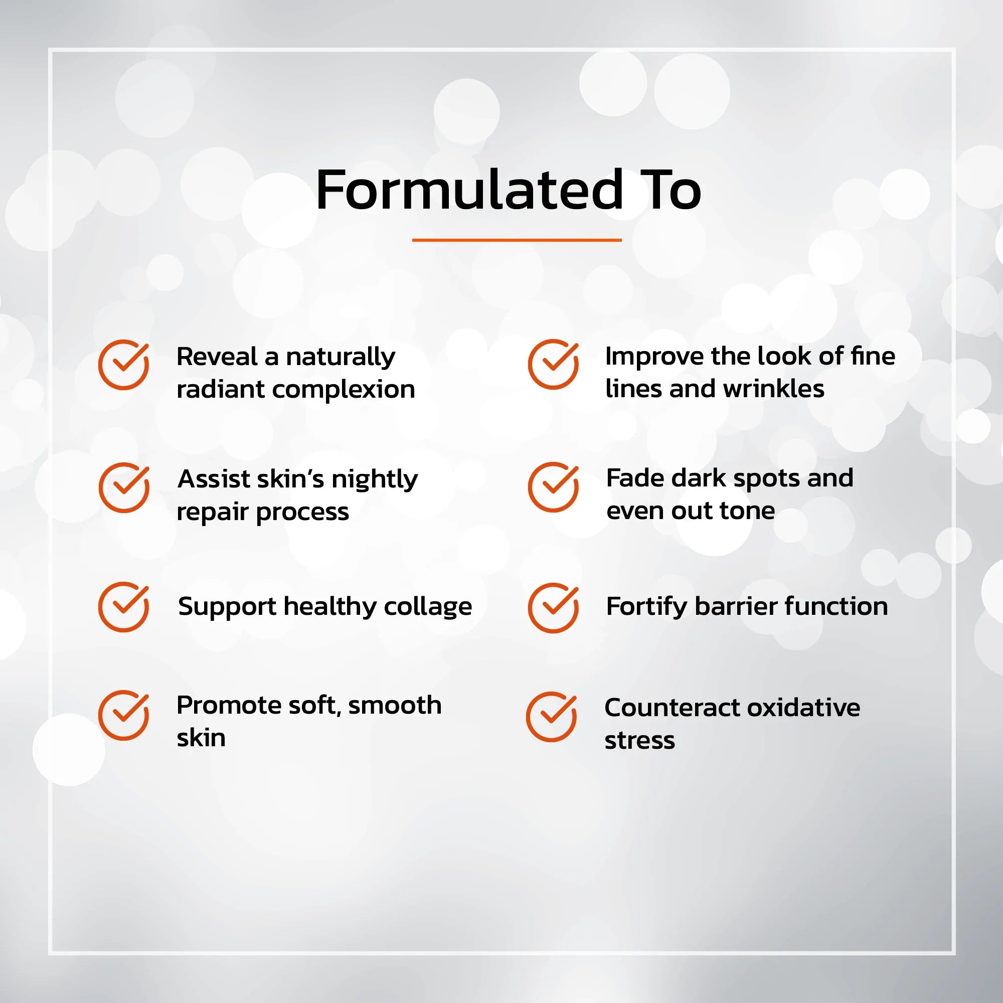 Skin's renewal processes work hardest at night, so we've designed this formula to support and stimulate the vital functions that encourage optimal health and regeneration.