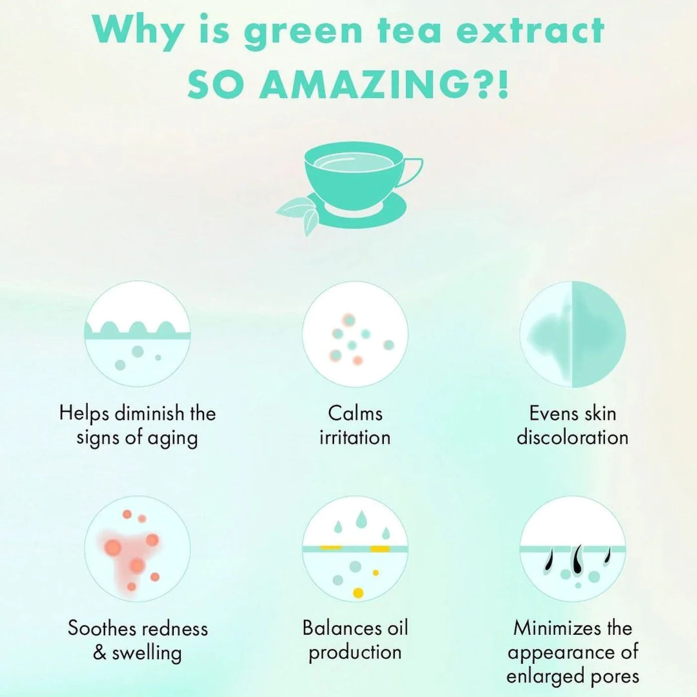 Green Tea Extract: Maintains moisture and soothes skin while visibly clarifying and pulling out impurities for a radiant-looking complexion.